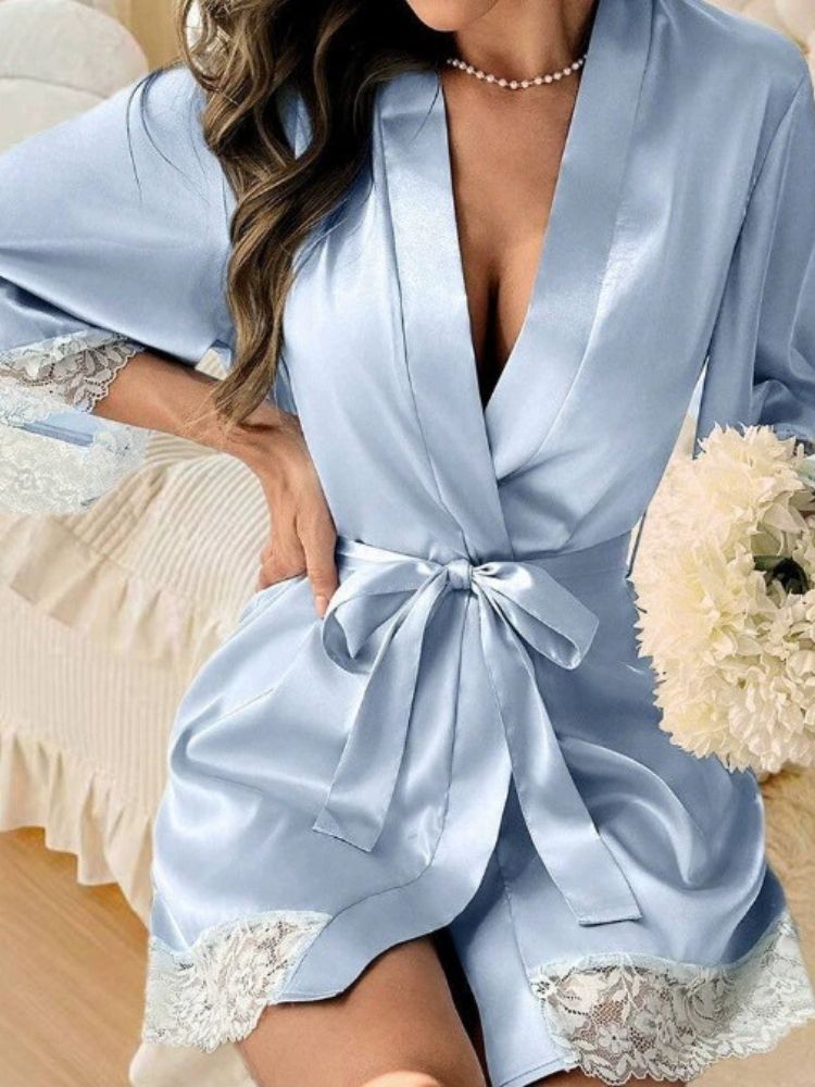 • Détails : finitions dentelle aux manches et à l’ourlet, ceinture à nouer