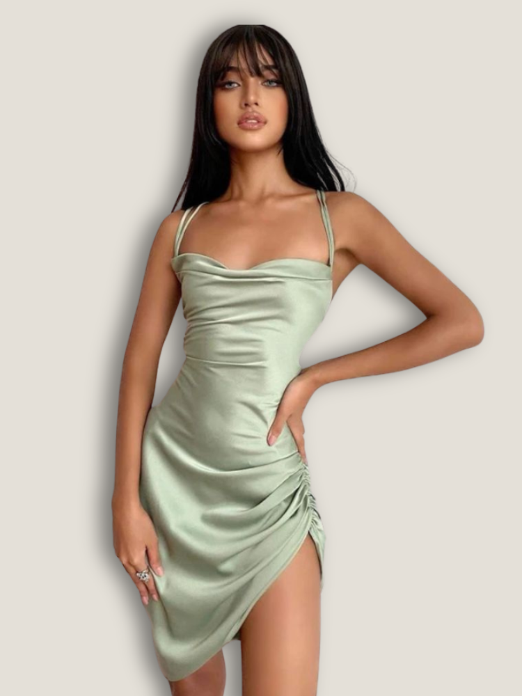 Robe courte en satin vert sauge – Élégance et allure sensuelle