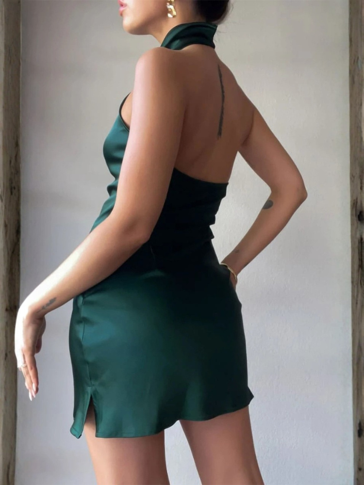 Cette robe courte en satin allie minimalisme et glamour. Son tissu soyeux épouse les formes avec délicatesse, tandis que son col montant et son dos nu apportent une touche sophistiquée et audacieuse. Une pièce idéale pour briller lors de vos soirées, dîners ou événements spéciaux.